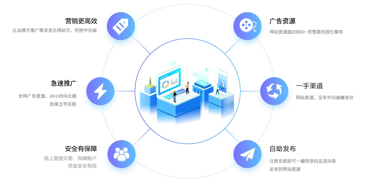廣告資源一鍵發(fā)布,迅 速將您的產(chǎn)品和企業(yè)信息覆蓋至 全網(wǎng)各個(gè)渠道。